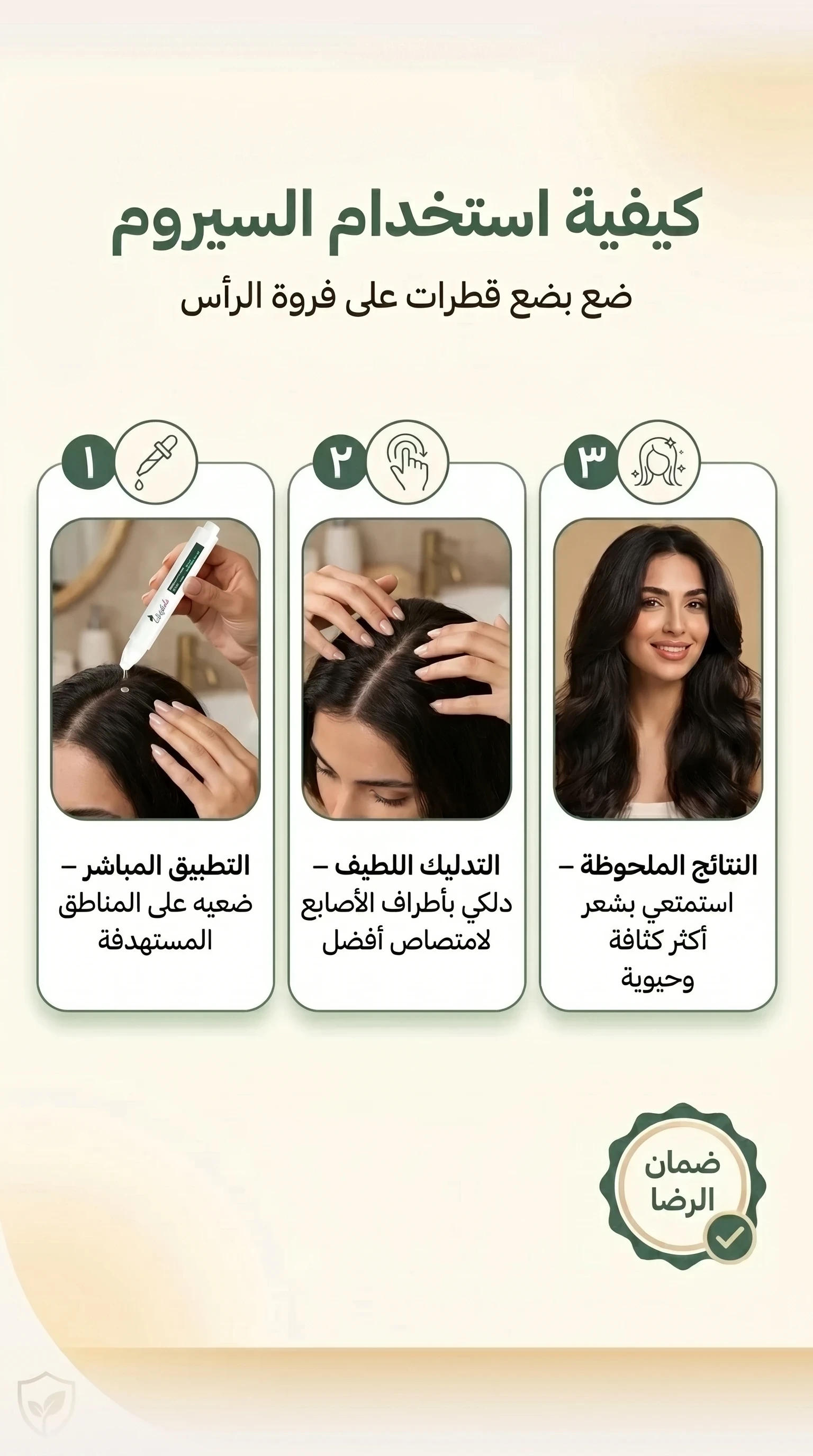 سيروم طبيعي خفيف يغذي فروة الرأس ويقوي البصيلات من الجذور ليقل التساقط ويبدأ الشعر الجديد بالظهور بشكل أوضح خلال أسابيع قليلة. مناسب للرجال والنساء بتركيبة غير دهنية سهلة الاستخدام مع توصيل سريع خلال 24 إلى 48 ساعة والدفع عند الاستلام وضمان استرجاع لمدة 14 يوم.